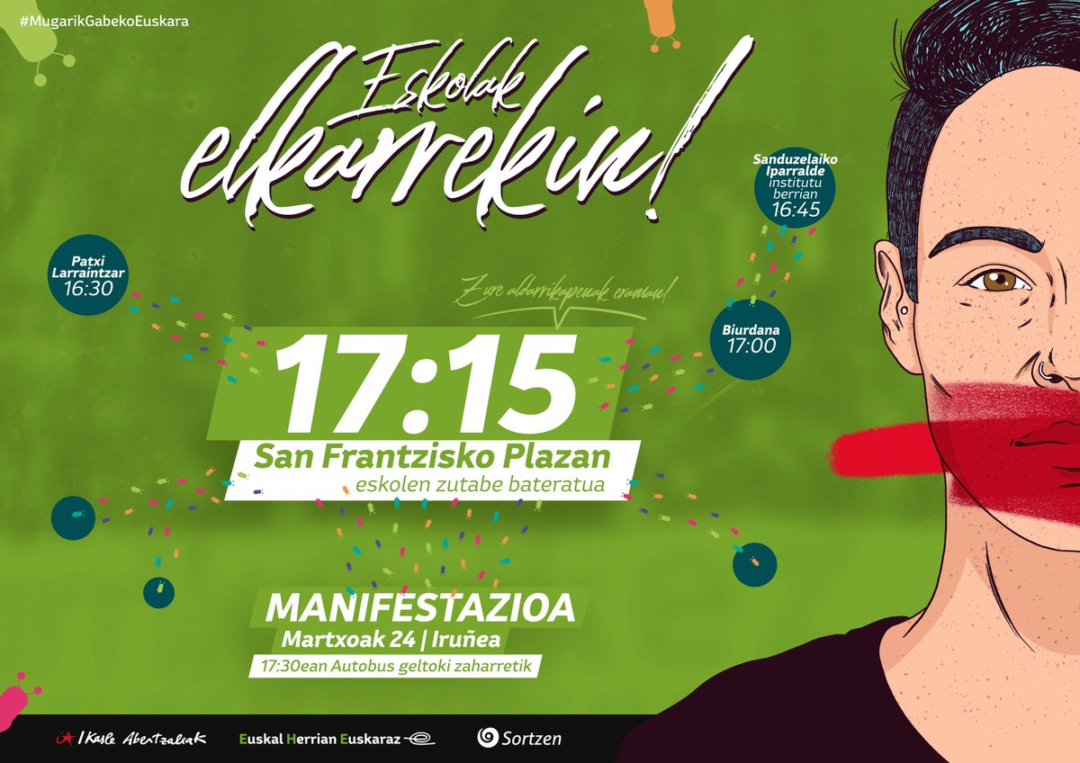 Sortzenek proposatzen du eskolak elkarrekin joatea, ibilbide honekin: 16:30 Patxi Larraintzar 16:45 Sanduzelaiko Iparralde institutu berriko orubean 17:00 Biurdana 17:15 Eskolen zutabe bateratua San Frantzisko Plazatik. Zure aldarrikapenak eraman!